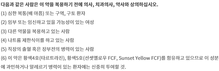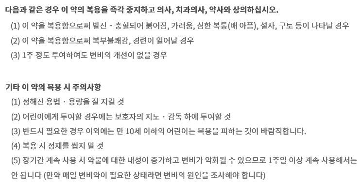 또한 1주일 정도 복용하였음에도 변비증 상의 개선이 없다면 복용 중지하시길 바랍니다.