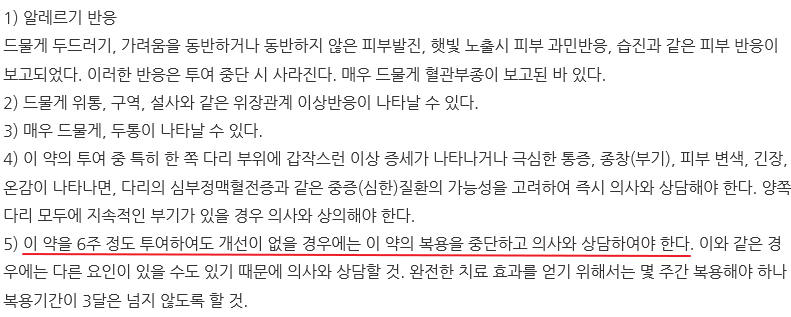 다만 이 약의 복용 중 한쪽 다리가 붓거나, 통증, 피부색 변호, 긴장, 열감 등의 증상이 나타날 경우