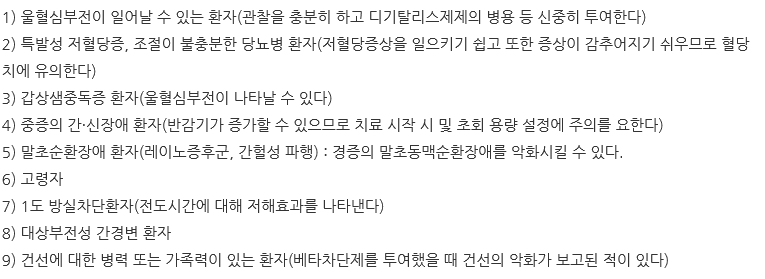 당뇨병 환자 중 조절이 불충분한 경우 저혈당 증상의 확률이 높을 수 있음으로 신중해야 합니다.