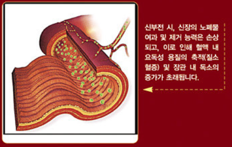 그 결과로 혈액 내 요독성 용질의 축척으로 질소혈증과 장관 내 독소 증가를 초래하게 됩니다.