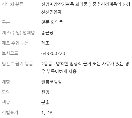보험적용이 가능한 약으로(보험코드 643300320)으로, 분홍색 원형 필름코팅정으로 1,DP의 식별표기가 특징입니다.