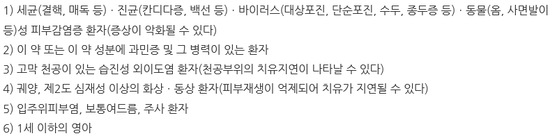 즉, 결핵, 매독, 칸디다증, 백선, 대상포진, 단순포진, 수도, 동물의 옴, 이, 등의 질환에 사용할 경우 오히려 증상을 더 악화 시킬 수 있기에 사용권장하지 않습니다.